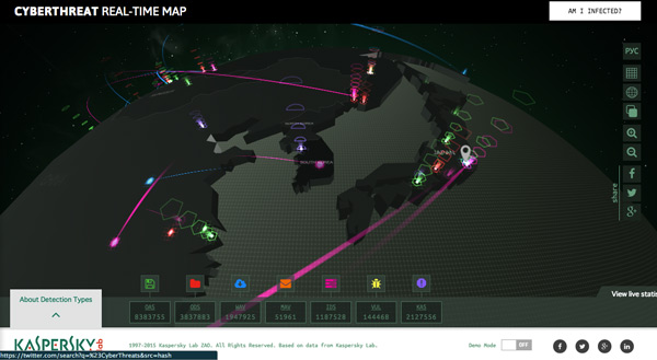 カペルスキー社が公開し、いま世界で起きているサイバー攻撃がわかるインフォグラフィック。地球儀を回転・拡大・縮小させながら閲覧できる。攻撃の発信源から攻撃対象に向かって、光の帯が伸びていくアニメーションで表現されていて、攻撃の種類によって色分けもされている。Webサイトを開いてみると、各国の間で休むことなくサイバー攻撃の応酬が行われている状況に驚くだろう。