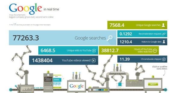 最後は、Googleの利用状況をリアルタイムに表示するインフォグラフィック。検索が行われた数やYouTubeの動画視聴数から広告の収益、Chromebookの出荷数まで、Googleの事業に関するデータを追うことができる。それぞれの指標についての詳しい説明もついている。Googleについて詳しく知りたいときに、参考になりそうだ。