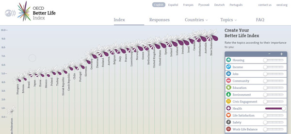 OECDが世界各地での調査結果をもとに作成・公開している。住宅、収入、雇用、環境、教育、医療など11の指標を国ごとに比較できるもので、それぞれの指標の値が花びらの色で表現されていて、「雇用」の指標の高い順に国・地域を並べ替えて比較したり、ひとつの国のデータを詳細にチェックすることもできる。データはリアルタイムではないが毎年更新され、これまでデータが掲載されていなかった国のデータも逐次追加。まさに世界の「今」を知ることのできる便利なWebサイトだ。
