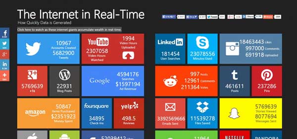 Twitterのツイート数やFacebookの投稿や「いいね!」の数、Amazonで購入された商品の金額など、インターネットのあらゆるSNSやサービスの利用状況がわかるインフォグラフィック。ページを表示させている間に情報は随時更新され、刻々とカウントアップしていく様子を見ることができる。