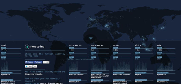 北米、南米、欧州、アジア、アフリカの5大陸におけるTwitterの使用状況を、宇宙から見る地上の夜景のようなインフォグラフィックでチェックできる。ツイートが行われた地点に光の点が蓄積していき、しばらく時間を置いて見ていると、星空のような美しい夜景ができあがる。地域ごとのツイート数や単語数も確認できる。