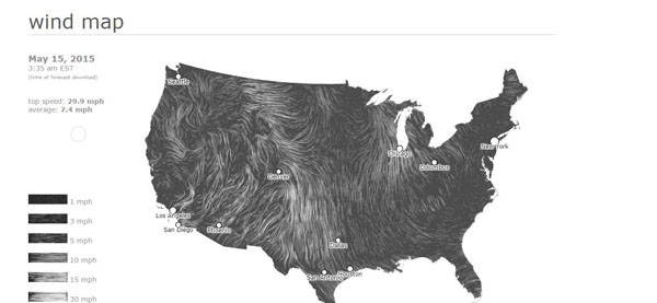 いま現在の風の向きと強さがわかる地図。北米地域に限定されているが、風の流れがアニメーションで表現されているので、とてもわかりやすい。特定の地域を拡大表示させることもできる。アウトドア活動で天候の変化を予測したりと、さまざまな用途に使えるだろう。