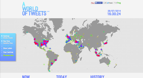 こちらも世界のTwitterの使用状況をリアルタイムに表示するインフォグラフィックだが、各地で投稿されるツイートの数をヒートマップで表している。日本の天気予報でよく見るアメダスのような表現なので、どの地域のツイートが多いのかがわかりやすい。各地域のツイート数のランキングや、国別の詳細データなども随時更新される。
