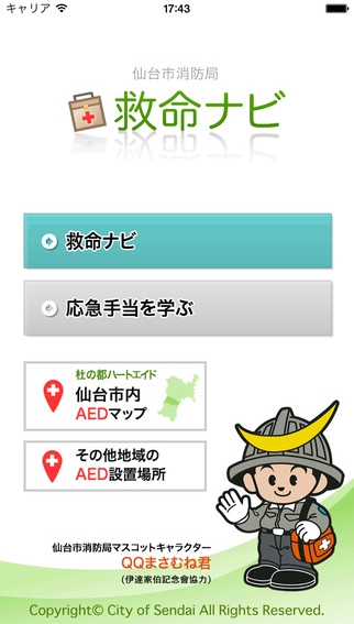 仙台市消防局が企画・制作した救命アプリ。学習機能のコンテンツでは、「心肺蘇生法の手順」「AEDの操作方法」「気道異物の除去方法」「止血法」を、動画とイラストで学べる。災害発生前に多少なりとも救命・応急手当の知識を得ておけば、いざという時に命を救うことに役立つはず。また、「音声ガイド付救命ナビゲート機能」も備わる。
