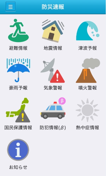現在地と設定した3つの地域の様々な災害の情報を取得できる。「緊急地震速報」や「地震情報」では、各地の震度や到達予想時刻の予測、観測結果の速報などが得られる。「噴火警報」では、箱根山などの噴火警戒レベルを導入している火山について、噴火警報が発表されるとニュース速報が流れる。ほかにも、台風や大雨に備える「豪雨予報」「津波予報」などの機能がある。