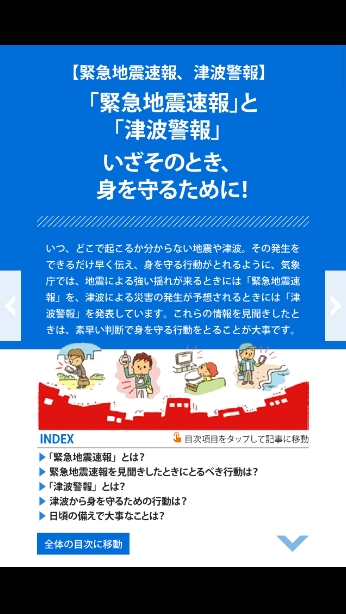 暮らしに役立つ情報をe-bookとして配信する内閣府政府広報室の公式のアプリ。情報をしっかり読み込むことで災害に備えられる。【防災・減災】地震・火山災害編では、「緊急地震速報」「津波警報」「住宅耐震化」「防災対策」などのカテゴリごとに詳しく解説している。また、政府インターネットテレビでは、「緊急地震速報が流れたら あなたならどうしますか?」などの動画が見られる。