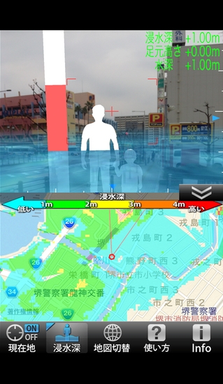 防災情報可視化アプリ。現在地にどれだけの津波被害があるのかを視覚で把握できる。たとえば、1mの津波がきたら大人の腰まで、子どもは全身が水に浸かってしまうということがわかる。当アプリは大阪府堺市の地域限定バージョンとなっているが、ARハザードスコープシリーズとして「東京23区」「三郷市」「川口市」「名古屋市」「葛飾区」「茅ヶ崎」の各自治体版がリリースされている。