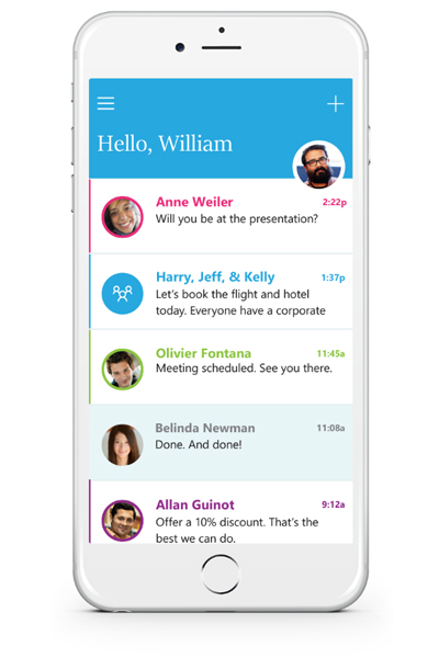 同アプリは同社の社内プロジェクト「Microsoft Garage」で開発されたアプリで、Windows Phone版およびAndroid版もまもなくリリースする予定。当初は法人向け「Office 365」利用者を対象に提供開始し、段階的に利用者を拡大する予定だ。連絡を取る頻度の高い相手を表示して短いメッセージをすばやく送ることが可能で、定型文も用意されている。Outlookと同期することも可能だ。