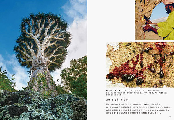 本書には、傷をつけると血を流す「竜血樹」、10mを超える怪物サボテン、7年に1度しか咲かない世界最大級の花、ギネス認定の20kgの種子など、日常では見ることがない貴重な植物の写真も数多く収録されている。シンプルな構成をベースにした誌面レイアウトで、手書き文字を加えるなど随所に工夫も盛り込まれており、楽しくページを捲りながら写真を堪能することが可能。“どう見ても、サル”のように見えるラン科の「ドラクラ・シミア(ドラキュラ・シミア)」などや、所々に開いた穴からキツツキがひょっこりと顔を出しているサボテン科の「ベンケイチュウ」をはじめ、思わず微笑んでしまうような愛らしい写真も楽しめる。
