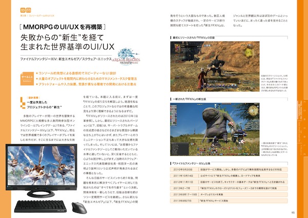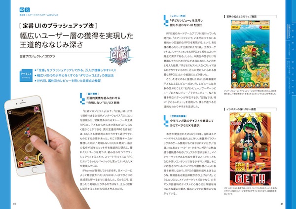 成功事例として、「FF14:新生エオルゼア(スクウェア・エニックス」「モンスターストライク(ミクシィ)」「ぼくらの甲子園!ポケット(面白法人カヤック)」「白猫プロジェクト(コロプラ)」とにかくゲームフリークなら誰もが知る超ヒットタイトルがズラリ。ゲーム開発者に欠かせないUI/UXの基礎知識から定番UIのブラッシュアップ法、知っておきたいマーケティング・広告領域におけるフレームワークなど、開発のヒントが満載の一冊となっている。