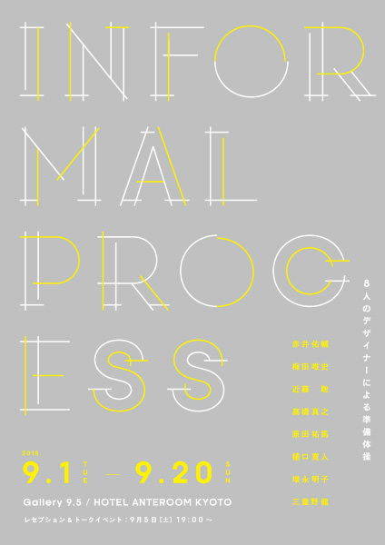 2015年9月1日(火)から9月20日(日)まで、GALLERY9.5(ホテルアンテルーム京都)にて企画展「INFORMAL PROCESS – 8人のデザイナーによる準備体操」が開催される。関西を拠点に活動する8名のデザイナー(赤井佑輔氏/梅田唯史氏/近藤聡氏/髙橋真之氏/原田祐馬氏/樋口寛人氏/増永明子氏/三重野龍氏)が参加する展覧会。会期中無休、入場無料、時間は12:00〜19:00で、2015年9月5日(土)19:00からはレセプション&トークイベントも実施される。