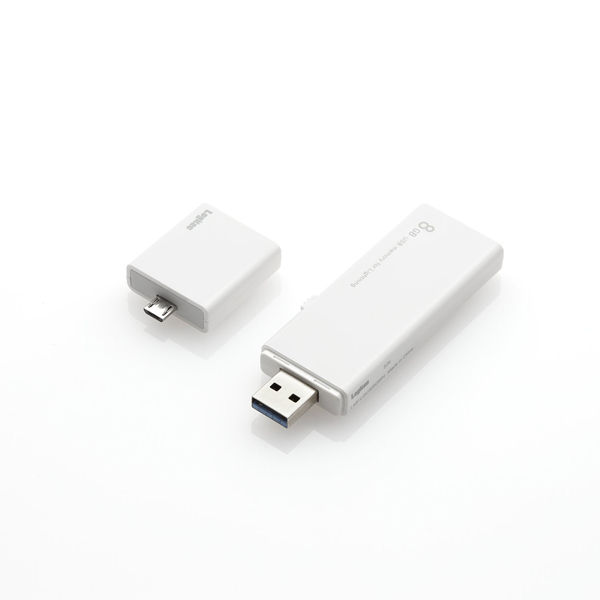 64GB、32GB、16GB、8GBの4種類から選べる。専用アプリはDropboxを利用できるクラウド機能やボイスレコーダー機能を搭載するほか、音楽や動画の再生も可能。スライド式でキャップレスのためキャップ紛失の心配がない。microUSB変換アダプタも付属している。サイズは69×28×10mm、重量は14g。