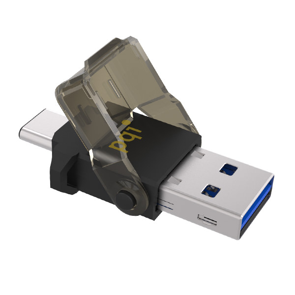 回転式キャップを搭載した旋回型デザインのデュアルコネクタUSBメモリ。容量は32GBのみ。サイズは42.76×18.80×12.71mm。