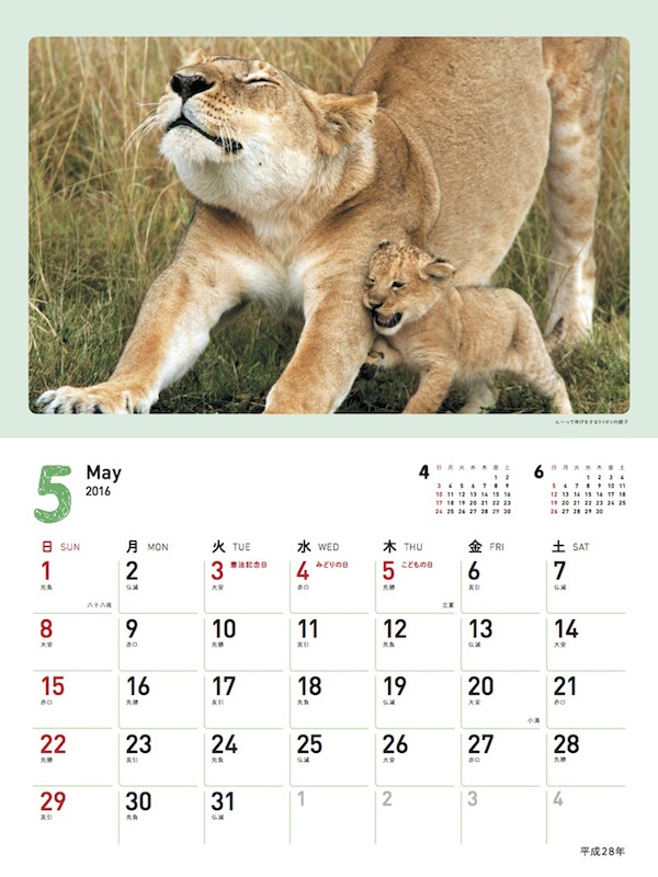 アッカンベーをするキリン、お互い寄り添いながら気持ちよさそうに笑うライオンの親子、まるで人間のようにウインクをするシロフクロウ、興味津々で近づいてきて笑顔をふりまくアザラシの赤ちゃんなど、そんなかわいくて表情豊かな動物たちが大集合の大ヒット写真集『SMILE! 動物のかわいい笑顔の写真集』がカレンダーとして登場。月をめくるごとに違う笑顔を見せてくれる動物たちを眺めていると、自然とこちらも笑顔になるほどどれも「かわいらしい」のひとことに尽きる! ひとときの癒やしの時間を与えてくれるカレンダーだ。