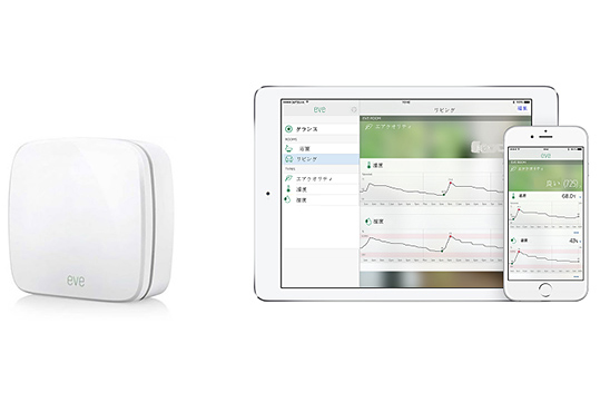 同センサーを使うことにより、設置した場所(空間)の温度や湿度、エアクオリティ(空気中の有機化学物質の状況)などをiPhoneやiPadの「Elgato Eveアプリ」を通じてモニタリングすることができる。また、Apple Homekitに対応しており、測定したデータはアプリで確認できるほか、Siriとの連携も行える。なお、Apple Homekit対応商品の日本での販売は本製品が初となるという。