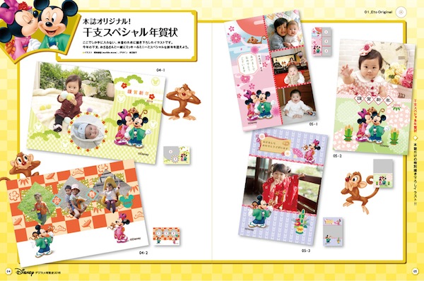 好きな写真と組み合わせて使えるフォトフレームのデザインカードをドーンと約360点(バリエーションを含む)収録しており、どんなキャラクターを使おうか迷っちゃう大人気の年賀状ブックが今年も登場。新たに大人気映画ベイマックス、インサイド・ヘッドが仲間入りしているほか、本誌だけの描き下ろしの申年スペシャルイラストや、おなじみのミッキー&フレンズ、アナと雪の女王、チップとデール、ディズニープリンセス、小さなプリンセス ソフィア、くまのプーさん、スティッチ、モンスターズ・インク、トイ・ストーリー、カーズなどなど、根強い人気を誇るキャラクターも収録。