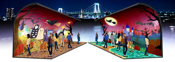 「お台場イルミネーション“YAKEI”ハロウィンver.」は、お台場海浜公園および「デックス東京ビーチ」の3Fシーサイドデッキにて開催。イルミネーションは毎日18時から点灯され、時間は24:00までとなっている。360°トンネルタイプの屋外参加型プロジェクションシステム「イリュージョンドーム(ILLUSION DOME)」も、会期中はハロウィン仕様で展開。この「イリュージョンドーム」は、大きさ53畳分の映像が映し出される仕様で、アートに気軽に触れて楽しみ、創造力を育むことができる。今回の映像内のイラストは、若手の絵本作家/イラストレーターであるyukiiro氏が手掛けており、「いたずら好きなおばけたち」がモチーフとされた。ドーム内に投影された映像に触れると、コウモリが飛び立ち、魔女が空を飛び、かぼちゃが菓子に変身し、ガイコツが手を振るなど、さまざまなギミックを楽しめる。