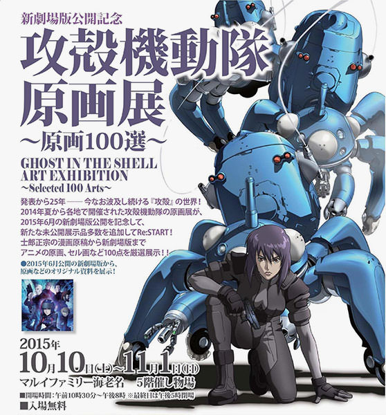 2015年10月10日(土)から11月1日(日)まで、マルイファミリー海老名 5F 催し物場にて「攻殻機動隊原画展〜原画100選〜」が開催されている。「攻殻機動隊原画展」は2014年夏から各地で開催されており、作品の生誕25周年と新劇場版の公開を記念して、新たな未公開展示作品も数多く追加。士郎正宗氏の漫画原稿から新劇場版まで、アニメの原画/セル画/設定資料など100点が厳選展示されている。入場無料で、時間は10:30〜20:00(最終日は17:00閉場)。