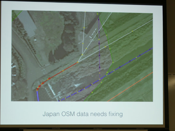 このOSMデータを使ってビジネスを展開している企業のひとつが、今回のSotM2015で基調講演を行った米MapBoxだ。同社はOSMなどのオープンな地図データを使って、ユーザーがさまざまなデザインの地図を作成できるサービスなどを提供している。同社データチームのArun Ganesh氏は今回のSotM2015において、日本のOSMデータに関する課題について講演を行った。同社が日本でのビジネス展開を検討するにあたって日本のOSMデータを確認したところ、主に都市部から離れた郊外において道路ネットワークデータと写真データがズレている箇所があり、交差点がうまくつながっていないケースが見られた。「MapBoxのデータチームは、日本のOSMデータの改善に取り組んでいます。まず狭い地域で試験的に修正を行い、どのように修正すればいいのかを明らかにして、より大きな地域に進出したいと考えています」とGanesh氏は語る。