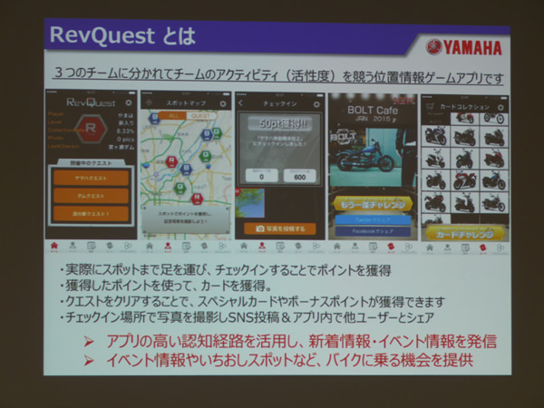 このほか、ヤマハ発動機株式会社の藤本勝治氏による、OSMを活用した位置情報ゲームアプリ「RevQuest」の紹介も行われた。同アプリは、3つのチームに分かれてチームのアクティビティ(活性度)を競う位置情報ゲームアプリ。実際にスポットまで足を運んでチェックインすることでポイントを獲得し、獲得したポイントを使ってカードを獲得する。クエストをクリアすることでスペシャルカードやボーナスポイントを獲得することが可能で、チェックイン場所で写真を撮影してSNSに投稿したり、アプリ内で他ユーザーにシェアしたりすることもできる。同社は同アプリを、新着情報やイベント情報を発信するなど、プロモーションの一環として提供している。