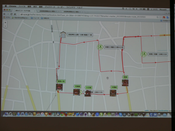次に、「日本Androidの会」の浜松支部長を務める市川雅明氏による講演「屋台どこサーチの紹介」も行われた。「屋台どこサーチ」とは、お祭りの屋台(お祭りの出し物)の位置をOSM上へリアルタイムに表示するサービス。屋台のルートや休憩所を表示したり、お祭りの運行情報をマーカーで表示したりすることもできる。屋台にはSIMフリーのAndroidスマートフォンを搭載し、位置情報をサーバーに定期的に送信し、位置情報を受信してWebブラウザ上のマップに表示する。すでに「浜松まつり」「山東まつり」など地元の祭りでの使用実績もあり、細かい改良を繰り返している。今後の改善点としては、屋台の向きや通過した点の履歴表示、作成した屋台のルートのシミュレーション、アクセス解析の導入などを検討している。