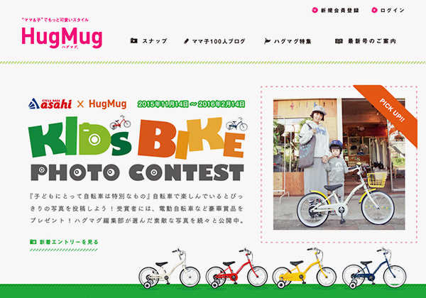 本フォトコンテストは、ママ&子どもの“可愛い”リアルなスタイルを発信するファッション&ライフスタイル雑誌「HugMug」(株式会社シー・レップ)とのコラボレーション企画であることも大きな特徴だ。応募作品の中から選ばれた「グランプリ」(1名)や「入賞」(10名)には電動アシスト自転車「エナシス べルファム」をはじめとする各種プレゼントが用意されているが、そのほかに「HugMug vol.15」(3月7日発売号)への雑誌掲載も受賞特典とされている。なお、応募作品はコンテストWebページのほか、ハグマグ雑誌およびWebサイト/各種SNS、サイクルベースあさひWebサイト/各種SNS/カタログ/各店舗ポスター・パンフレットに使用される場合がある。
