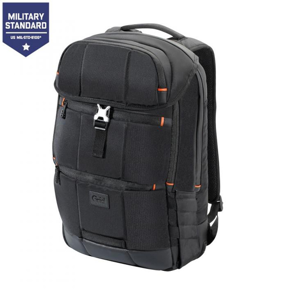 1.2mの高さからの落下試験に合格した、軍調達基準(MIL-STD-810G)の耐衝撃性能を誇る製品。全天候型ポリコート・ベースを採用し、雨風にも強い。最大15.6インチのノートPCを耐衝撃パッドに収納できるほか、フロントにはジッパー付の収納部、サイドにはペットボトル用のポケット、背面には貴重品を収納できる隠しポケットを備え、さまざまなアイテムを収納できるようになっている。