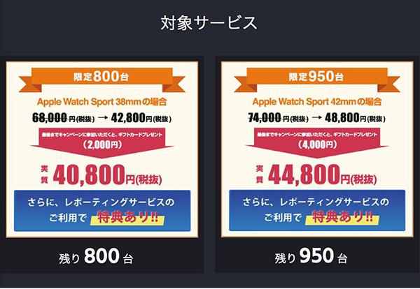 割引の対象になっているのは、Apple Watch Sportの38mm/42mmモデル。それぞれ37%割引で買えるほか、38mmモデルでは2000円、42mmモデルでは4000円のギフトカードがプレゼントされる。