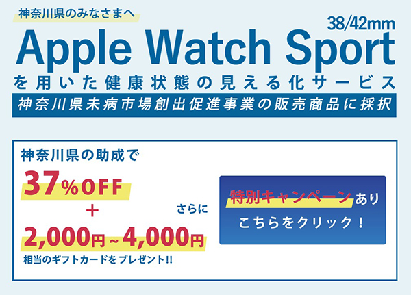 神奈川県は3日、「未病市場創出促進事業」として、「Apple Watch Sportを用いた健康状態の見える化サービス」を実施すると発表した。キャンペーン期間は、12月3日(木)~1月31日(日)※1月3日までの購入と、1月4日までのデータ収集開始が必要。