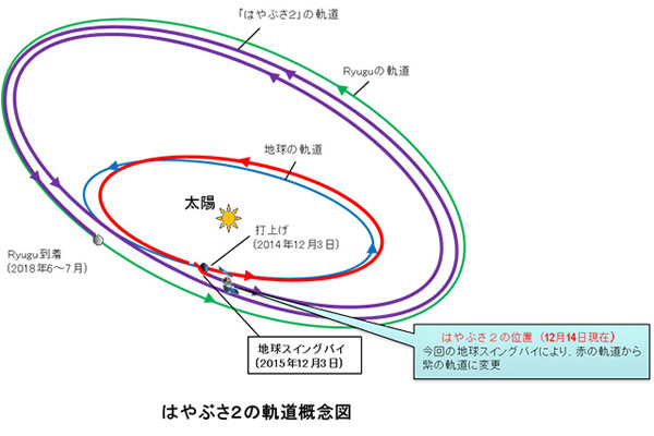 国立研究開発法人宇宙航空研究開発機構(JAXA)は、小惑星探査機「はやぶさ2」の地球スイングバイ後の軌道の計測と計算を行い、同探査機が目標としていた軌道上を順調に航行していることを確認したと発表した。また、同探査機が地球スイングバイを終えたあとに撮影した地球の写真も公開した。