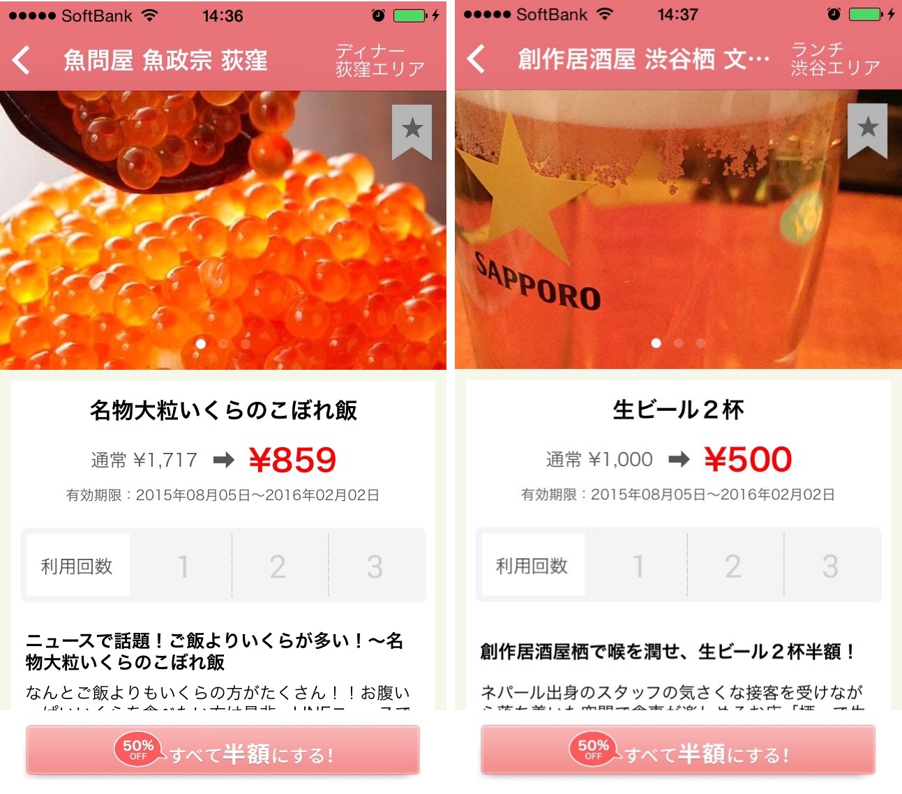 本アプリは、様々なお店の指定されたメニューを半額で購入・利用できるクーポンアプリ。ジャンルはランチ・ディナー・ビューティーの3つが揃い、常時100種類以上の半額メニューが並ぶとしている。掲載店舗のエリアは、恵比寿、渋谷、中目黒、原宿などで、都心部のお店がほとんどだ。
