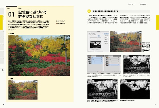 補正作業のテクニックは細かく挙げていったらキリがないのだが、本書は「室内で暗くなった花を明るく」「人物の顔色を明るく見せる」などの代表的な補正事例(全33例)を出し、補正の仕組みと美しい仕上がりへの道筋をとてもわかりやすく紹介している。また、実際に補正に扱うPhotoshopなどソフトウェアについても触れており、ソフトの活用法も懇切丁寧。ひとつひとつの事例をもとに確かめて作業していけば、自ずと総合的なスキルは上がっていくことだろう。