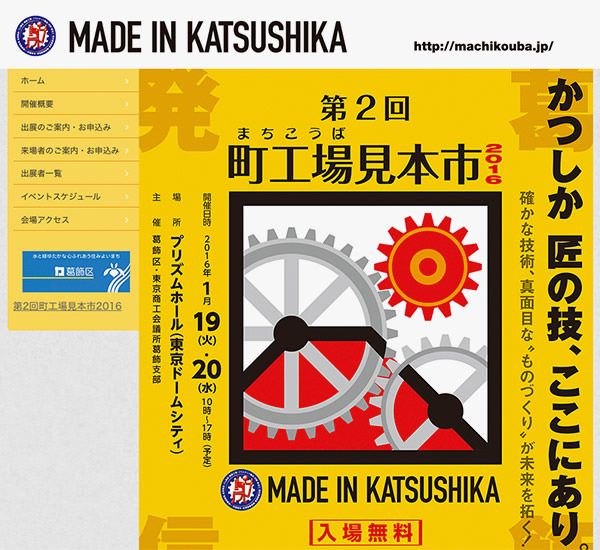 2016年1月19日(火)および20日(水)に、東京ドームシティ プリズムホールにて、東京都葛飾区の「第2回町工場見本市2016」が開催される。「かつしか 匠の技、ここにあり」をテーマに、葛飾区内および近隣地域の企業や団体が出展。約70社の下町の町工場が集結し、確かなモノづくりの技術と、そこから生み出される製品が披露される。入場無料で、時間は各日10:00〜17:00。