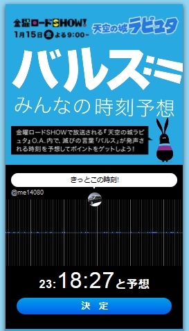 また、金曜ロードショーのサイトでは特別企画「バルス!!みんなの時刻予想」を開催。「バルス」が発声される時刻を予想して、的中したら金曜ロードシネマクラブのポイントが10000PTもらえるイベントとなっている(予想シェアだけでも100PT)。ちなみに、これまでの21時放送スタートの場合を例にとると、「バルス」タイムは23時20分頃が目安となっている。