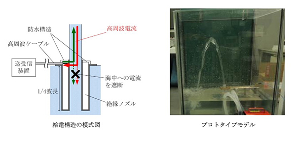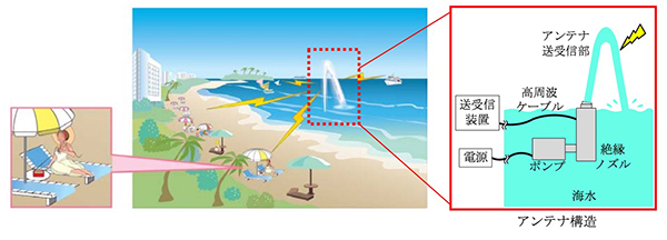 海水アンテナ「シーエアリアル」は、アンテナ送受信部である水柱だけに高周波電流を効率よく流す給電構造(絶縁ノズル)を開発。筒状の絶縁ノズルから海水を噴出することにより、電流が海中に流れることを遮断。十分な太さの水柱を噴出することで、アンテナとして利用するのに成功している。