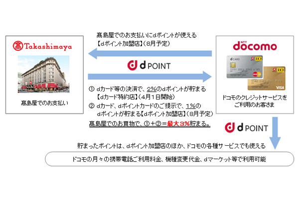 今回の業務提携により、全国の髙島屋の買物の際にdカードやdポイントカードを提示することにより、購入1回につき、購入額100円(税抜)ごとに1ポイントのdポイントを貯められるサービスを2016年8月をめどに開始する。貯まったdポイントは、1ポイント1円(税込)として髙島屋での買物に利用できる。