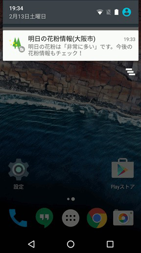 また、翌日の花粉が「非常に多い」と予測されるときは、19時頃にプッシュ通知で知らせる機能も備える。