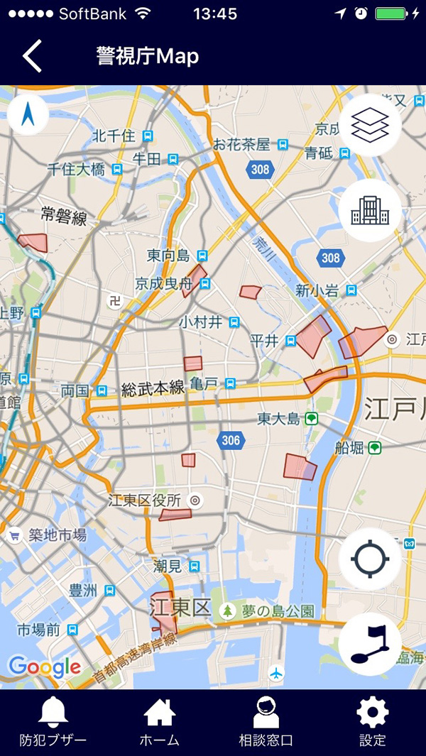 本アプリは「意外と使える」をキャッチフレーズに、警視庁管轄内(東京都)の様々な犯罪情報を得られる防犯アプリ。ホーム画面には、「MAP」「公開捜査」「Twitter」など、様々な情報へのリンクを掲載。「MAP」では、Googleマップと連動して、特殊詐欺やひったくり、公然わいせつ、不審電話などが今どこで発生しているかがひと目でわかる。また、「公開捜査」では、公開捜査となった事件の概要、発生日時、場所、被疑者の特徴、被疑者が映った動画などが表示される。「防犯ブザー」モードで押せば警戒音が大音量が流れる、防犯ブザー機能もある。