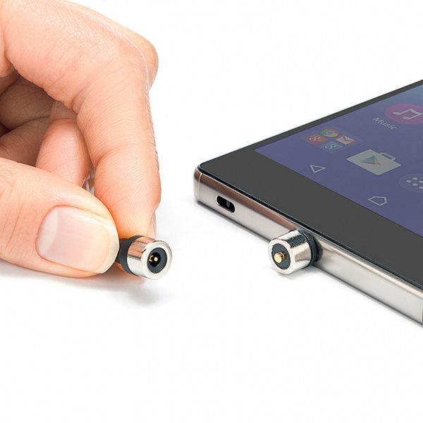 マグネットで簡単に脱着可能なので、充電中に着信があってもスムーズに電話に出られる。また、コネクタを毎回抜き挿しする必要が無いので、充電機器側のmicroUSB端子の劣化を防ぐことができる。