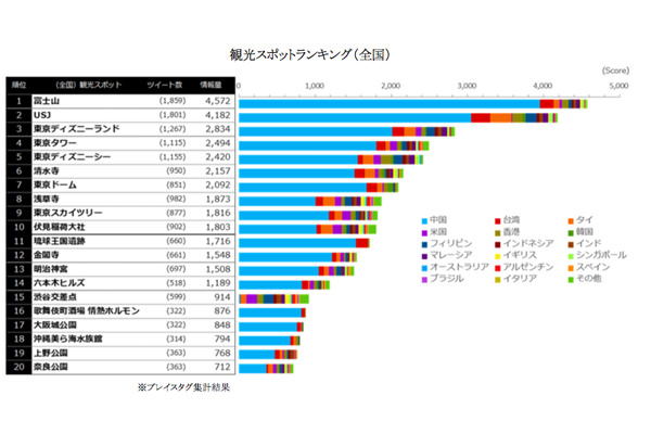 同レポートによると、ツイート情報量による観光スポットランキングついては「富士山」が最多で、2位の「USJ」と3位の「東京ディズニーランド」、4位の「東京タワー」などを上回った。なお、「富士山」でのツイートは、言葉よりも画像が中心だった。