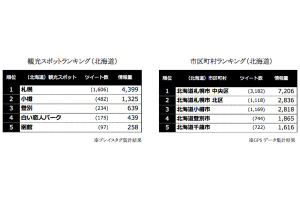 また、北海道に絞った分析によると、ツイート情報量による道内の観光スポットランキングは、「札幌」がトップで、2位が「小樽」、3位が「登別」だった。観光施設のトップは、「白い恋人パーク」で、市区別では「札幌市中央区」が1位だった。