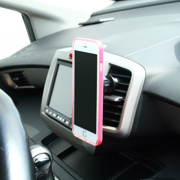 同製品は、エアコンルーバーに差し込むだけで簡単に取り付けられる車載スマホホルダー。ホルダーの先端は強力な磁石になっており、スマホ側に付属の鉄製プレートを取り付けて固定する。マグネットに付けるだけなので、ホルダーに挟む手間がない。