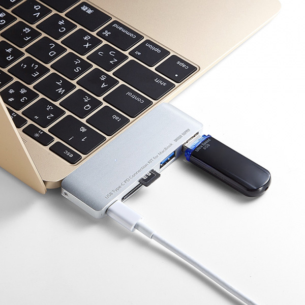「400-ADR306SPD」はUSB PD対応なので、MacBookに本製品を接続し、他のUSB機器を使用しながらMacBook本体の充電ができる。