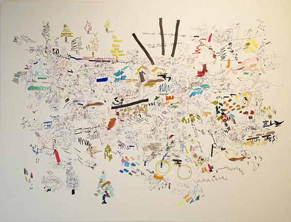 Okoimatsu氏は、多摩美術大学大学院を卒業後にロンドンの美術大学Chelsea College of Art & Designで学び、約4年にわたる作家活動を経て帰国後、札幌へと拠点を移した若手女性アーティストだ。文房具のペン売り場にある「試し書きの線」を模写 / 転写することで「都市の風景」を描き出した作品などが特徴。モチーフとなる試し書きの線は、誰に見せるためでもなく“油断”していてさまざまな様相が見られる。これを活用して、ロンドンで収集した試し書きはロンドンの風景、東京や札幌で集めた線はそれぞれ東京 / 札幌の風景に。行き交う人々が何気なく書いた線の集積が、「その街の潜在的な何か」の絵として見えてくる可能性を秘めている。
