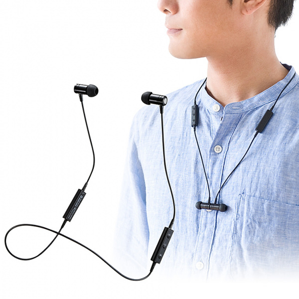 サンワ、マグネット着脱で音楽の再生・停止が可能なBluetoothイヤホンを発売
