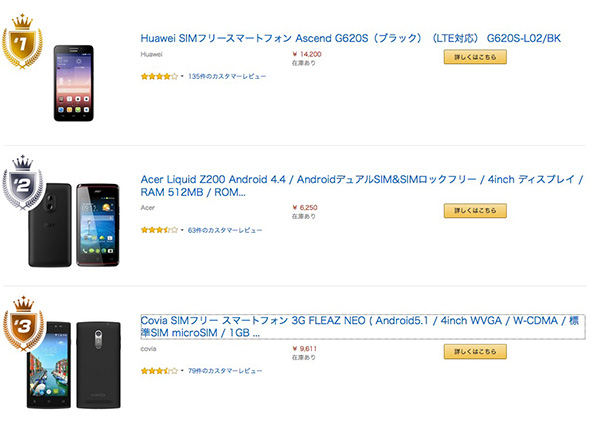 なお、2位には「Acer Liquid Z200 Android 4.4 / AndroidデュアルSIM&SIMロックフリー / 4inch ディスプレイ / RAM 512MB / ROM 4GB」6250円、3位には「Covia SIMフリー スマートフォン 3G FLEAZ NEO ( Android5.1 / 4inch WVGA / W-CDMA / 標準SIM microSIM / 1GB / 8GB ) CP-B43」9611円が入り、1万円以下のスマホの需要の高さを伺わせた。