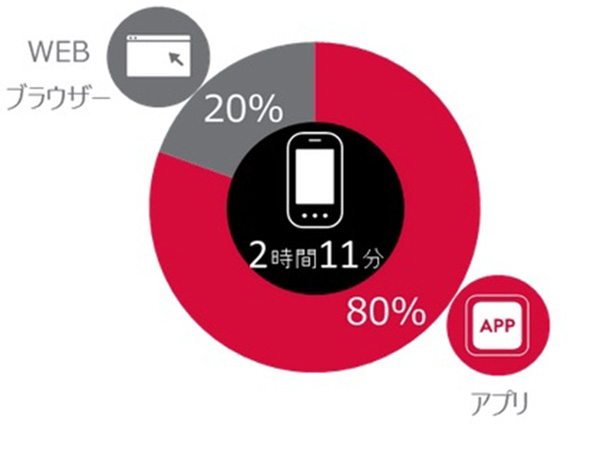 発表によると、2016年4月時点のスマートフォン利用者数は5496万人であり、日本の人口1億2696万人(2016年5月現在)の約43%がスマホを利用していることが分かった。また、一人当たりの1日の平均利用時間は2時間11分で、その内訳は80%がアプリ、20%がWebブラウザという結果になった。