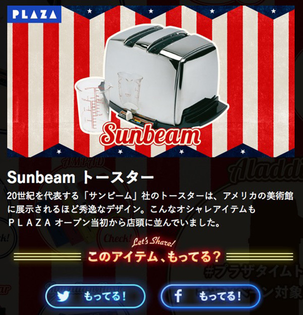 懐かしのネオンサインが掲げられた本サイトでは、トレンドを作り出したプラザのヒットアイテムを各年代別にまとめて紹介している。