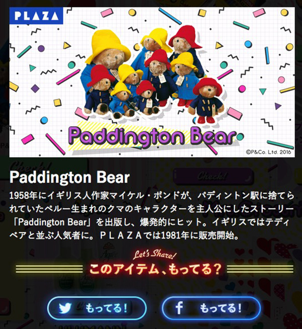 バブルで日本中が浮かれていた1980年代は、イギリス人作家がペルー生まれのクマキャラをモチーフにした作品を書いて人気になった「Paddington Bear」(パディントンベアー)、ルーズソックスの祖となるシティソックス社の「スラウチソックス」、カラフルさとユニークなデザインが人気の「Mrs.Grossman’s ステッカー」などがプラザを元に人気を爆発させていた。
