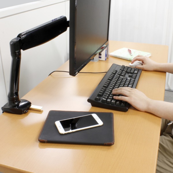 同製品は、10インチから27インチで重量5kgまでの液晶モニターに対応するガススプリング式モニターアーム。ガススプリングによる上下左右への滑らかな動きを実現しており、モニター位置移動をすばやく行うことが可能で、モニターをデスク端によけて、デスク上を広く使用することも簡単に行える。